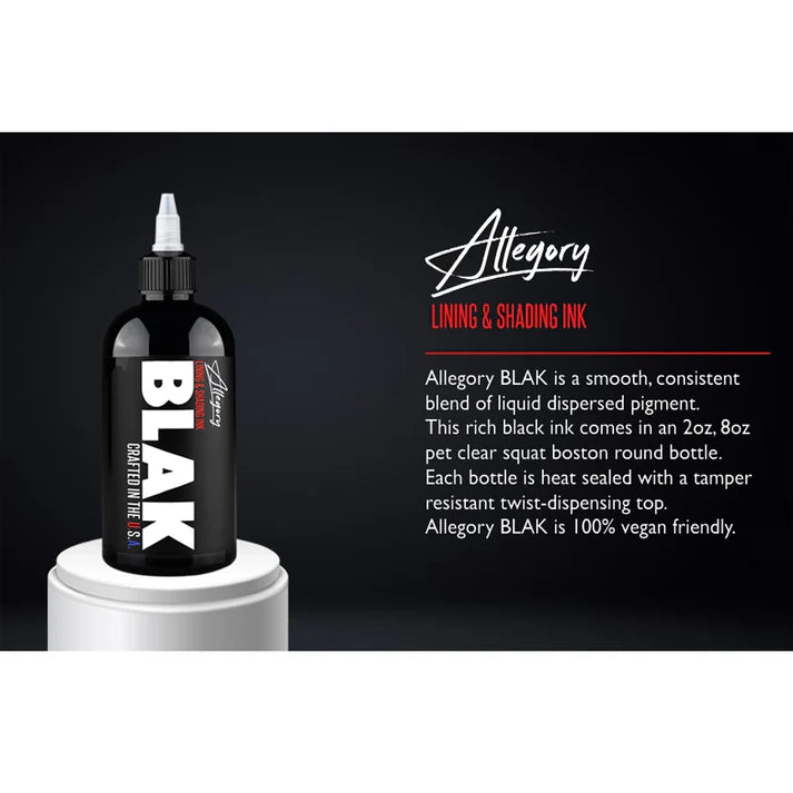 Allegory Black Tattoo Ink aims to provide artists with rich, reliable pigments for quality tattooing procedures. Their signature Black tattoo ink is everything an artist is looking for when it comes to black pigment.